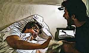 寝室に行き、寝ようとしている批評家の前で、