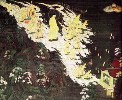 これに心を痛めた法然は、出家者でなくても、誰もが”阿弥陀如仏”を信じ、それにすがることによって死んだ後、極楽浄土に生まれて悟りを開くことができるという”易行道”の考えにもとづき、ただ「阿弥陀如仏」の名をとなえることだけで極楽浄土に往生できると説いた「浄土信仰」を広めました。