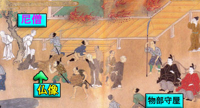 蘇我稲目の寺を焼き払い、仏像を難波の堀江に投げ捨てました。