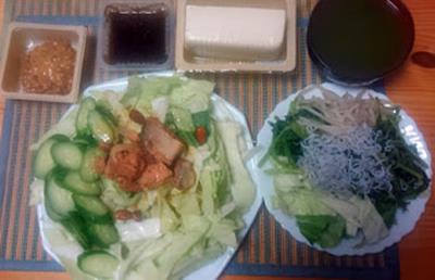 モロヘイヤ、サバ缶、しらす、